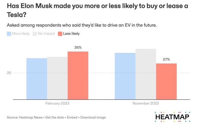 Heatmap 的查询显现,在马斯克最近一次引发争议的前几周,未来想要购买电动汽车的美国人中有 27% 表明,马斯克的行为使他们不太或许挑选特斯拉,而本年 2 月份这一份额为 36%。另一方面,想要购买电动汽车的美国人中有 35% 表明,马斯克的行为让他们更有或许购买特斯拉电动汽车。这与前次查询中受访者对马斯克的观点正好相反,其时更多受访者对马斯克的行为感到恶感,而不是产生积极影响。